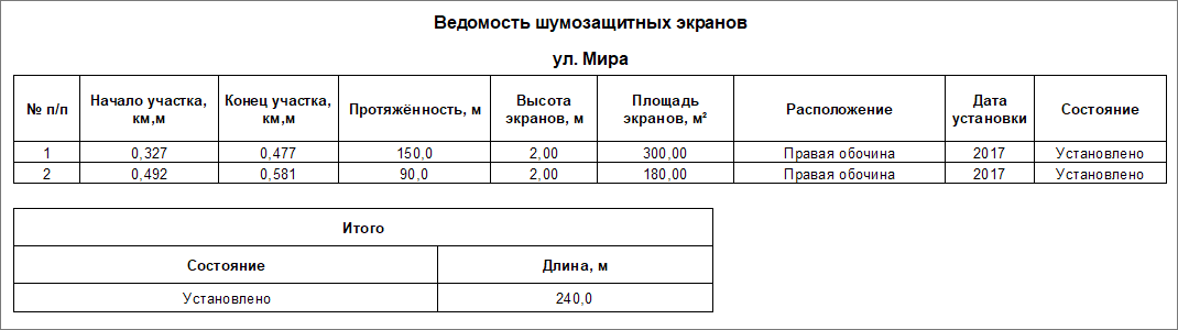 В ведомость шумозащитных экранов выводится информация о местоположении экранов на дороге, протяжённость, высота, площадь, дата установки и состояние.