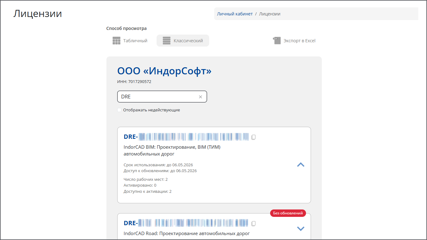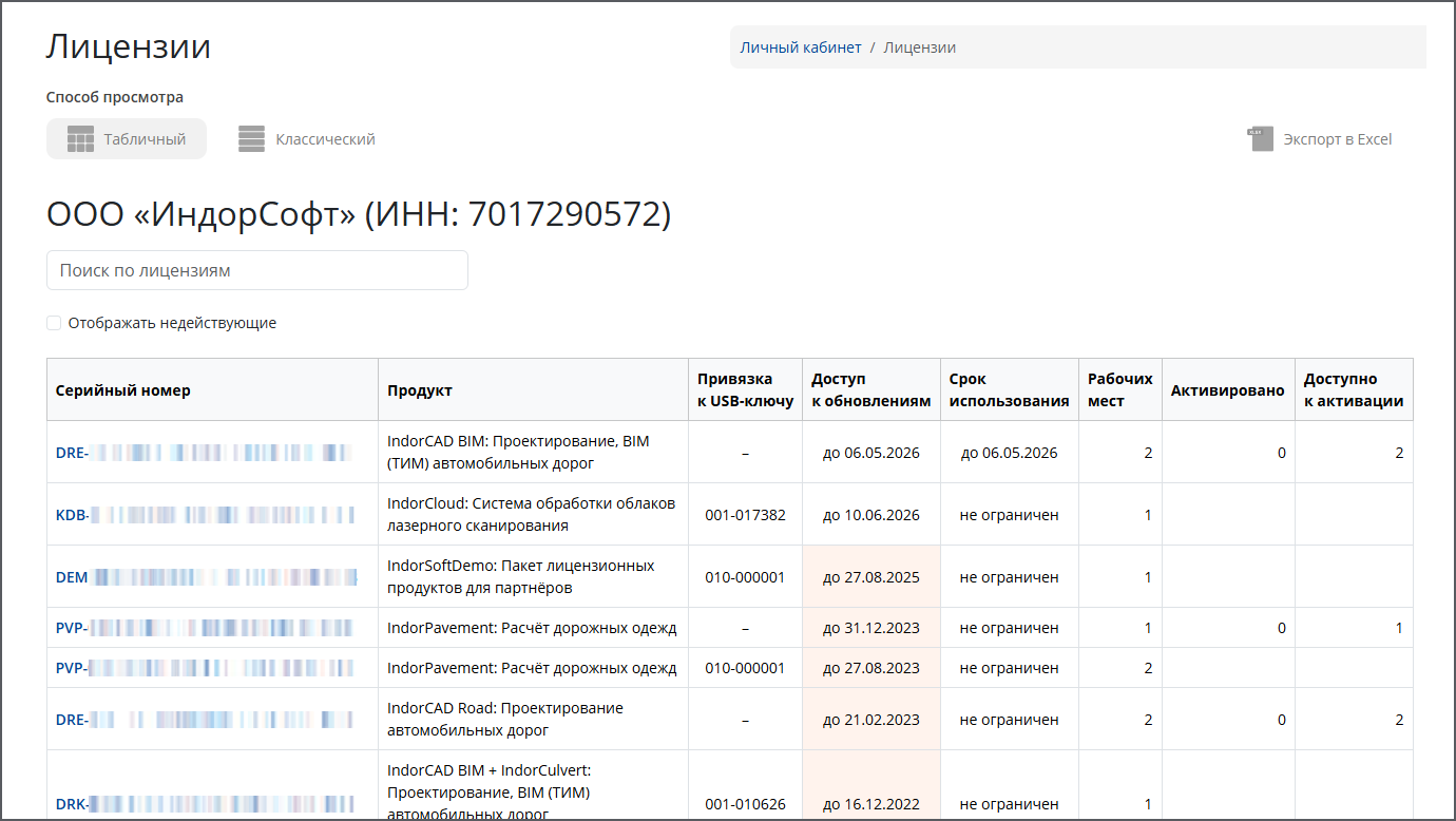 В новом разделе «Лицензии» — полная сводка по всем продуктам ИндорСофт, которые есть у вашей организации. С активациями, сроками и свободными местами.