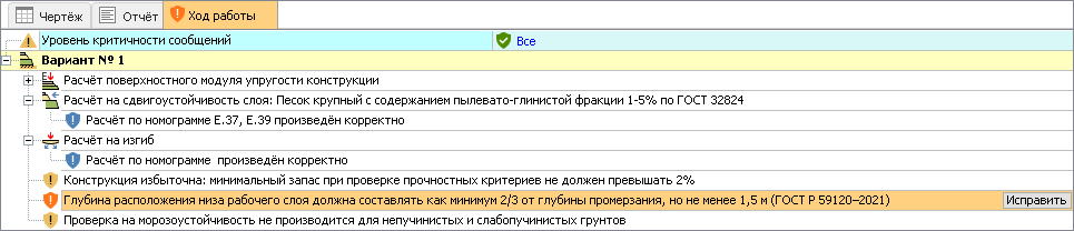 При расчёте толщины замены грунта система IndorPavement автоматически контролирует требование: глубина расположения низа рабочего слоя грунта должна быть не менее ⅔ глубины промерзания и не менее 1,5 м. Если проектировщик заложил меньше, система выдаёт предупреждение и одним нажатием исправляет значение до минимально допустимого.