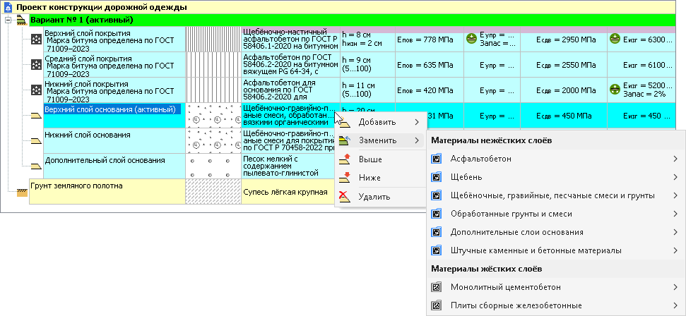Если в основании над асфальтобетонным слоем уложен укреплённый материал, система автоматически назначает равный коэффициенту m асфальтобетона такой же марки для покрытий. Нововведение помогает точнее выполнять расчёты при многослойных конструкциях без ручного ввода поправок.