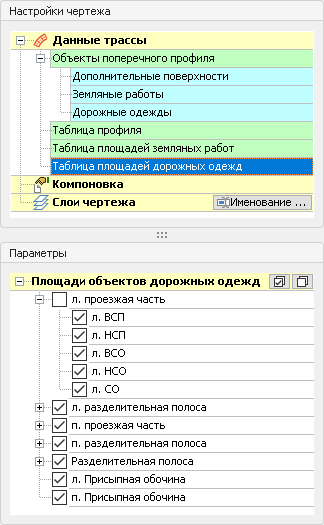 3. При формировании чертежа поперечных профилей площади слоёв дорожной одежды теперь можно вывести на чертёж без площади всего набора слоёв.