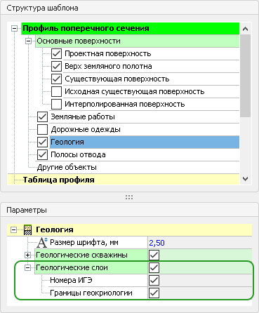 4. При формировании шаблона чертежа поперечных профилей добавлена возможность отключать видимость номеров ИГЭ и границ геокриологии.