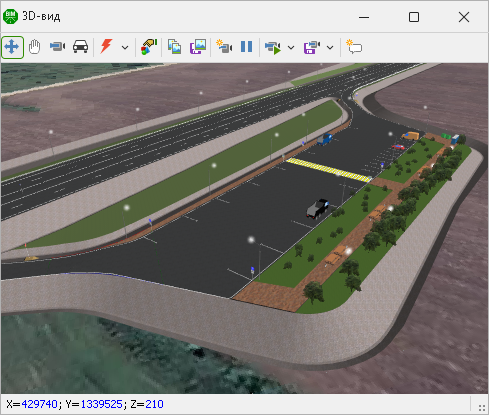 1. Появилась возможность задавать на трассе участки для раскладки бетонных плит. При раскладке учитывается геометрия трассы, а также данные о плитах: марка, количество плит в ряду и пр. Плиты встраиваются в поперечный профиль трассы и отображаются в 3D-виде.