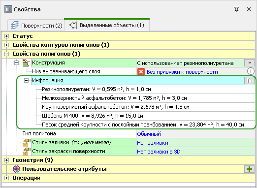 1. Если для полигона задана конструкция дорожной одежды, в его свойствах теперь отображаются объёмы каждого слоя конструкции. Данные об объёмах можно скопировать в буфер обмена.