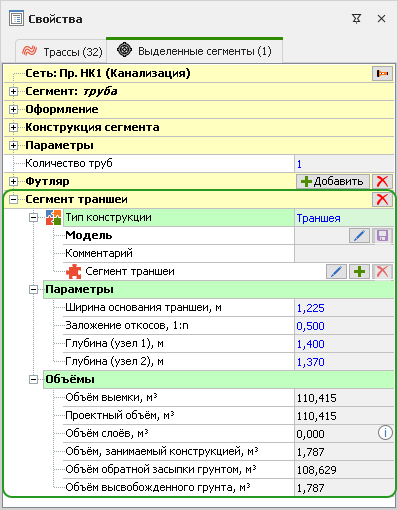 1. Появилась возможность учитывать в модели траншеи и котлованы. Котлован можно добавить в свойствах выделенного узла, траншею — в свойствах выделенного сегмента.