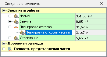 2. В окне Сведения о сечениях отображается длина сегментов проектной поверхности, участвующих в планировке откосов в насыпи и в выемке. Сегменты дополнительно подсвечиваются в рабочей области.